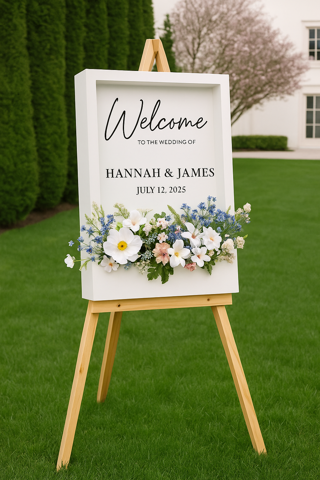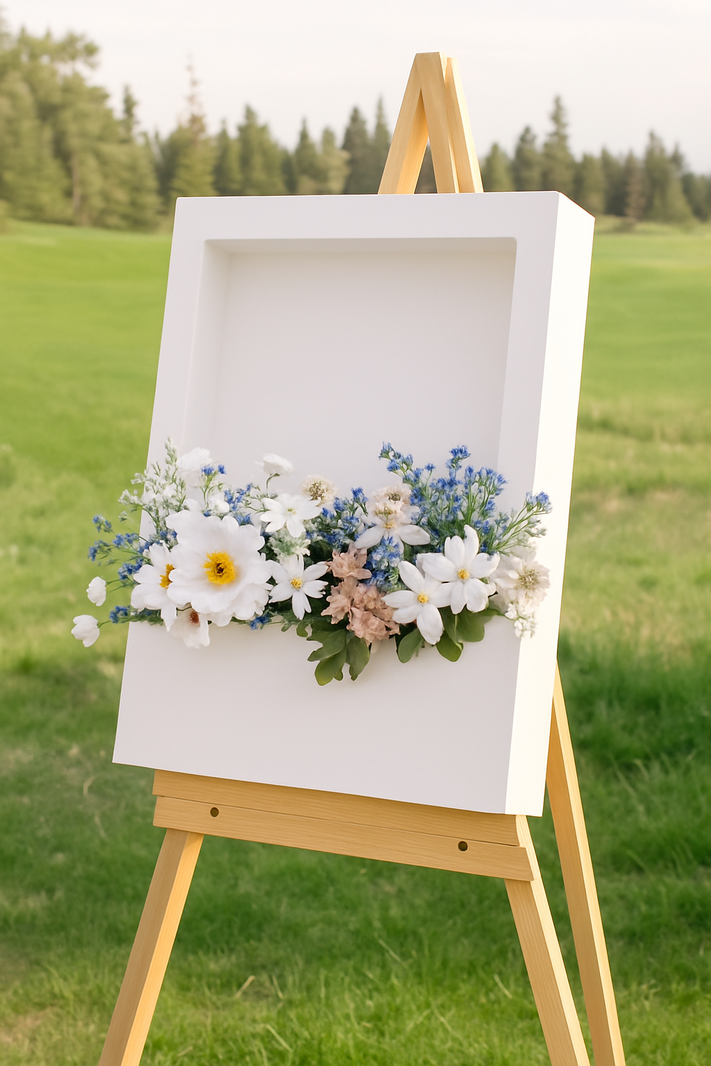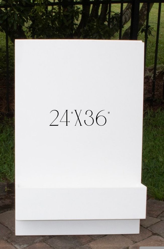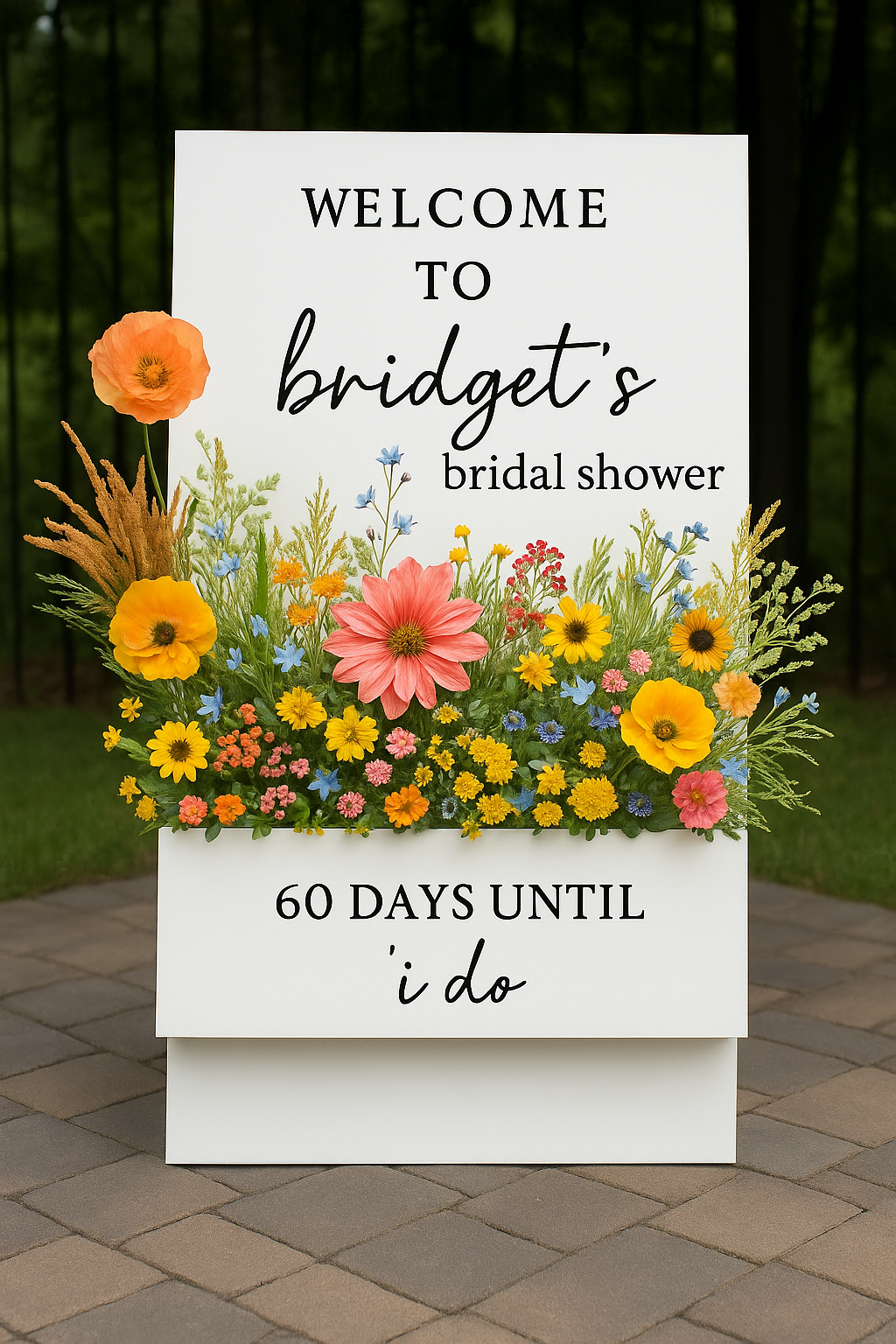 Freestanding Box Sign – Sits directly on the ground, lush faux florals NOT included